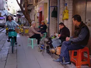 Time seems frozen in the Liwan District of Guangzhou. Only the scooters no longer make the same noise they used to; all charged with new energy, they attack nimbly and silently. Everything here is "on the street," especially laundry and flower beds. A shoemaker will resol and chat, and a handyman will fix anything. I'm reminded of a man sharpening scissors in my home town (long time ago)